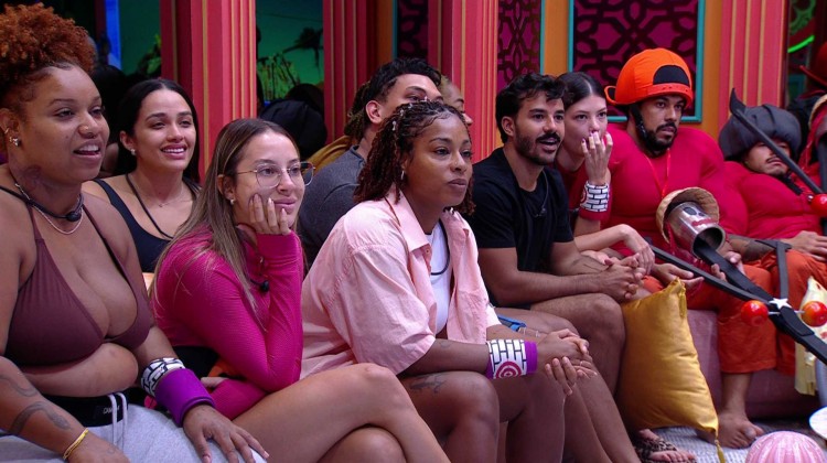 Enquanto Diego e Daniele Hypolito aproveitam o Almoço do Anjo no BBB 25 e assistem aos vídeos da família e dos amigos, o restante da casa acompanha o registro na sala.